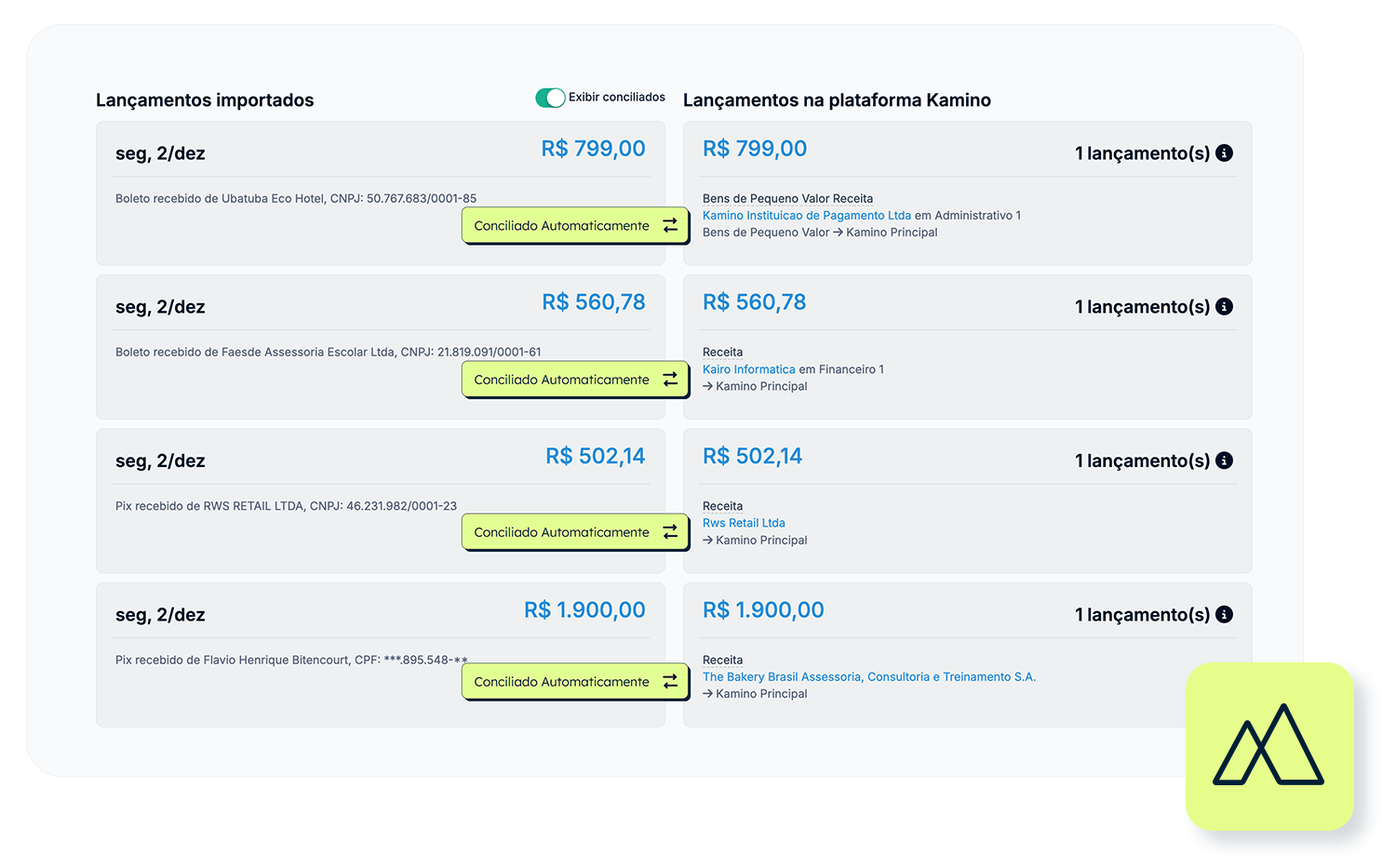 Enquanto os ERPs e outras plataformas demandam processos manuais, regras rígidas e suporte técnico para cada ajuste, a Kamino automatiza tudo: importa os extratos, reconhece os lançamentos e cruza os dados com seus pagamentos e recebimentos em tempo real.